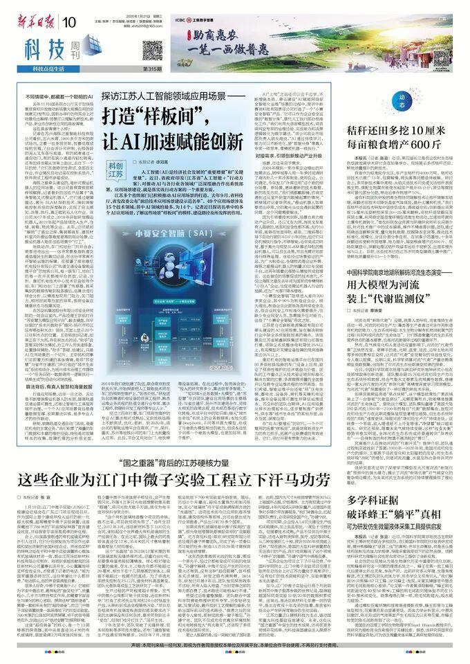 2026年1月21日,《新华日报》以《探访江苏人工智能领域应用场景——打造“样板间”, 让AI加速赋能创新》为题,报道了乐鱼体育等入选江苏省“前沿技术应用场景建设示范名单”企业,在应用场景建设方面的实践与成效。